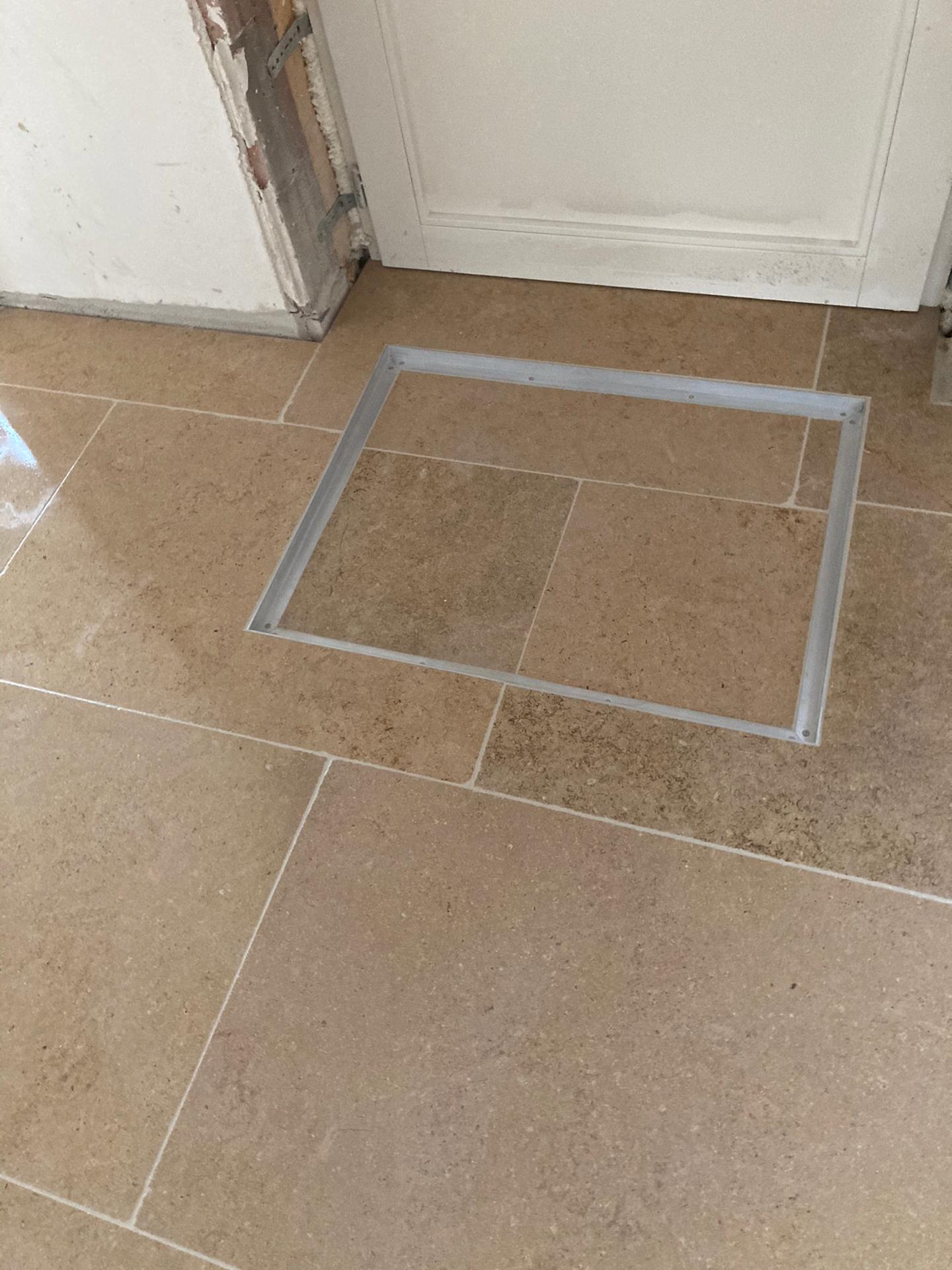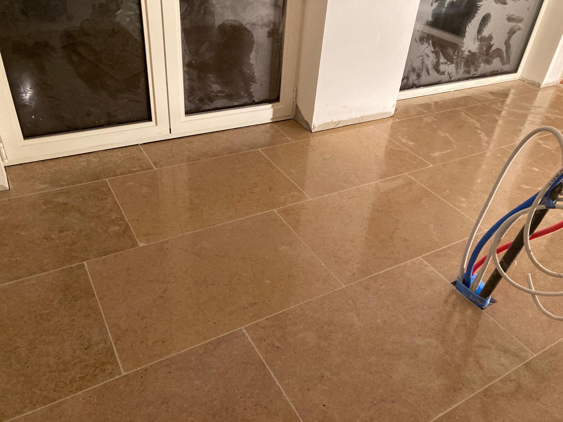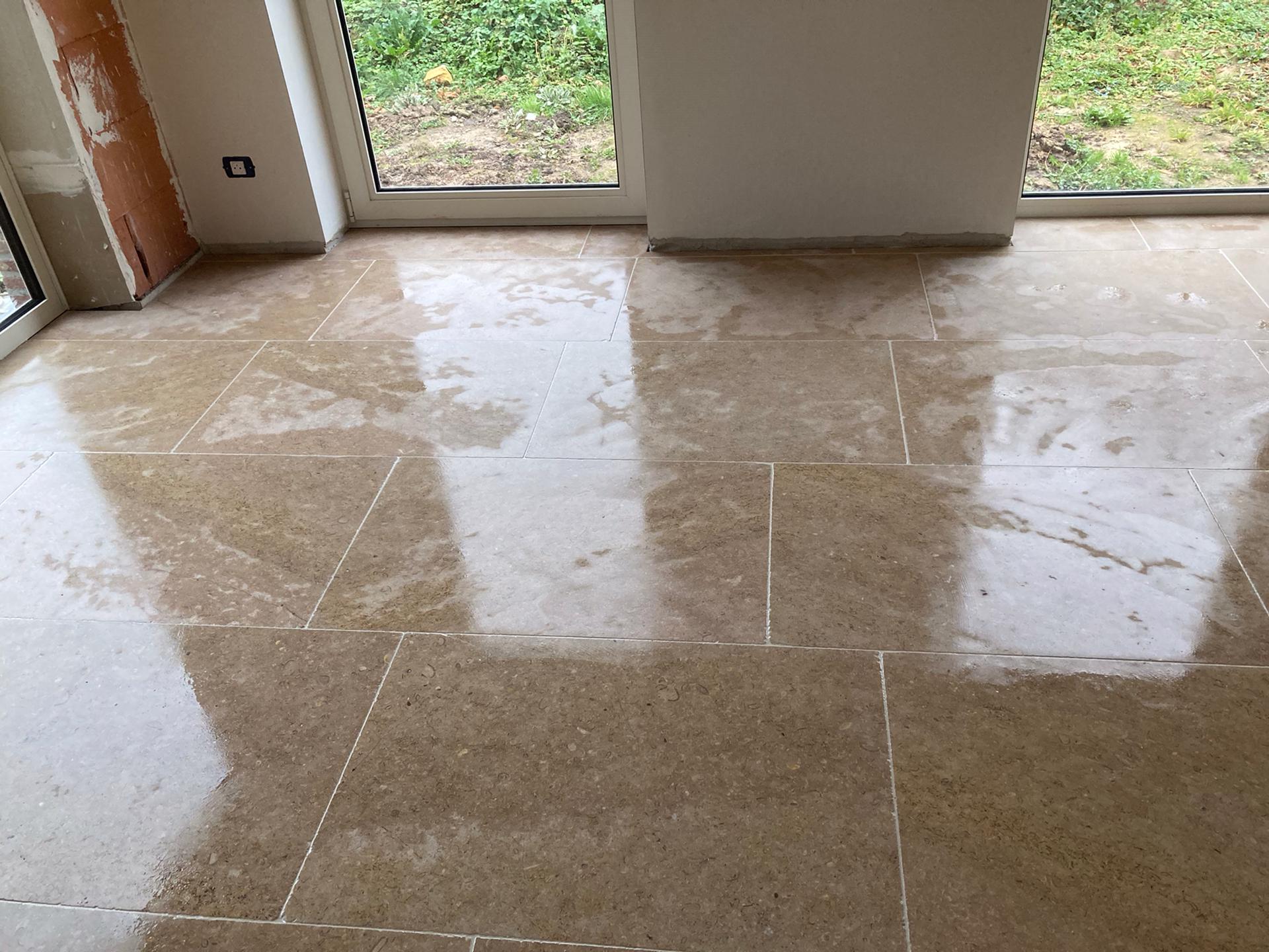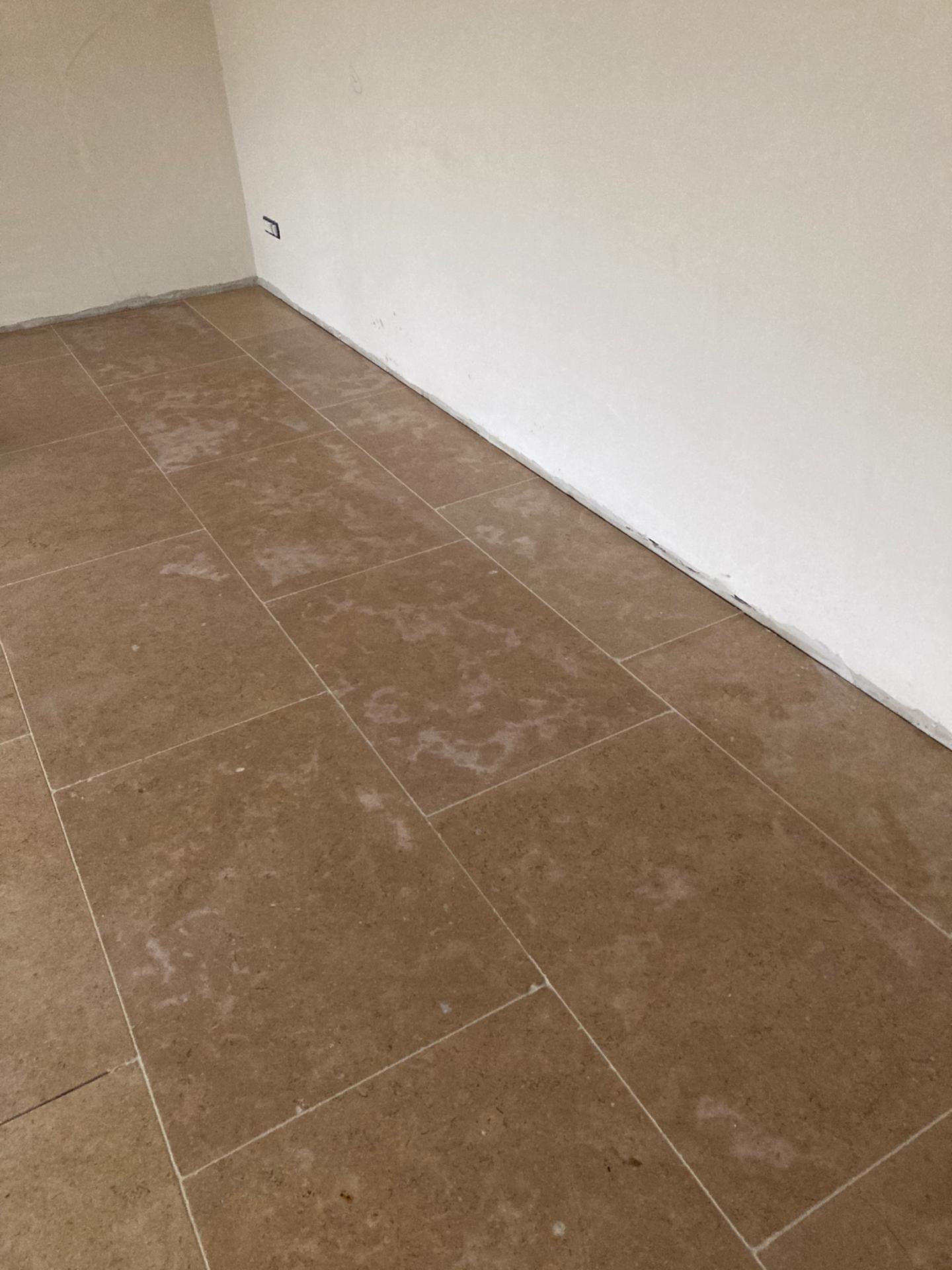 Renovatie van bestaande woning te Herne, plaatsing gekalibreerde natuursteen verlijmd op een vlakke chape formaat 60x90x2