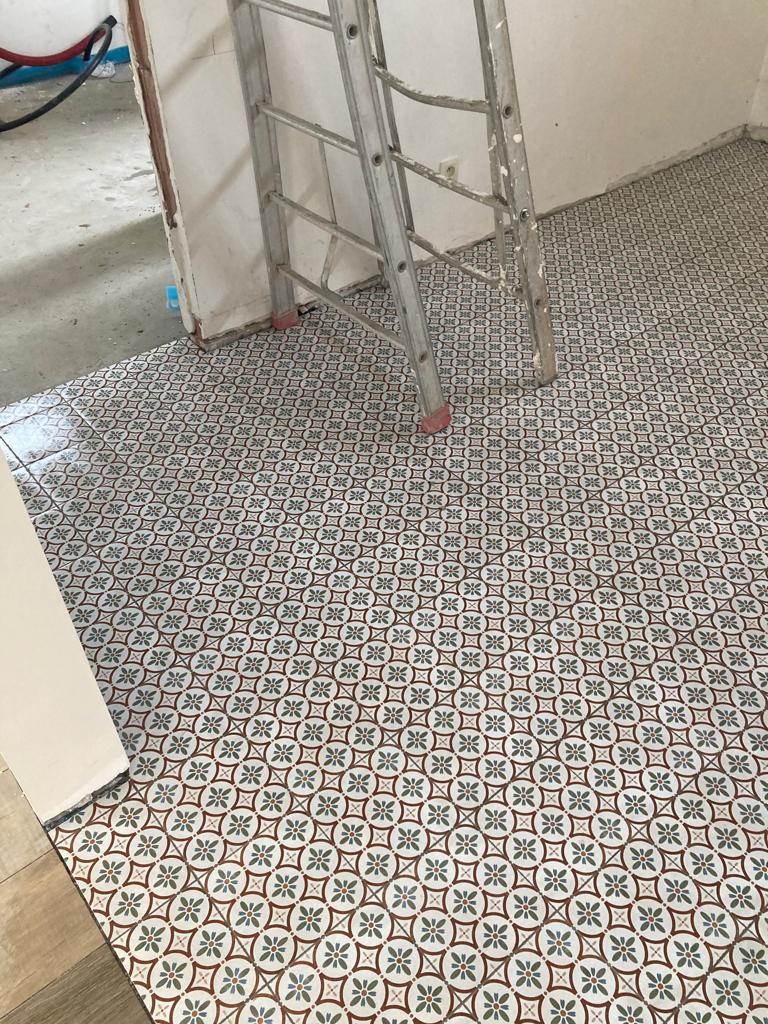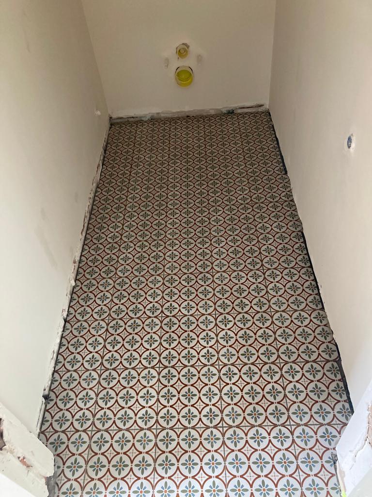 Plaatsen van tegels 20×20 Romanza Ariel in inkom en toilet te Bazel